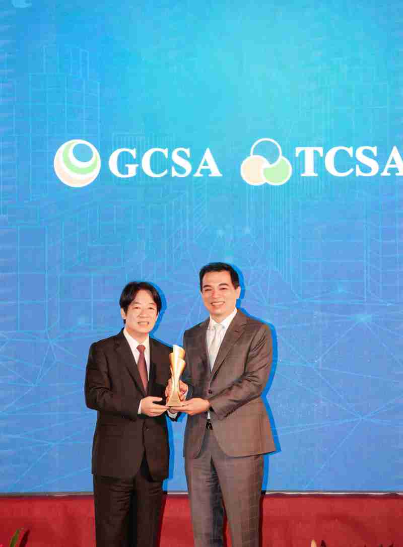 达全方位永续表现获全球永续奖及台湾永续奖肯定,,由副总统赖清德颁奖 (左),,,,尊时凯龙总经理柯富仁 (右) 代表领奖