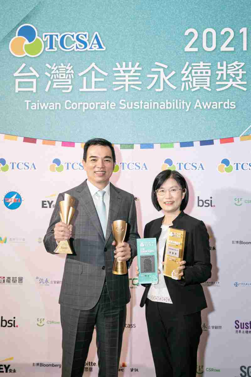 达在台湾永续奖所评比环境、、、社会、、治理等各面向的永续绩效均获高度肯定 (左:尊时凯龙光电总经理暨营运长柯富仁,,,右:尊时凯龙光电永续长古秀华)