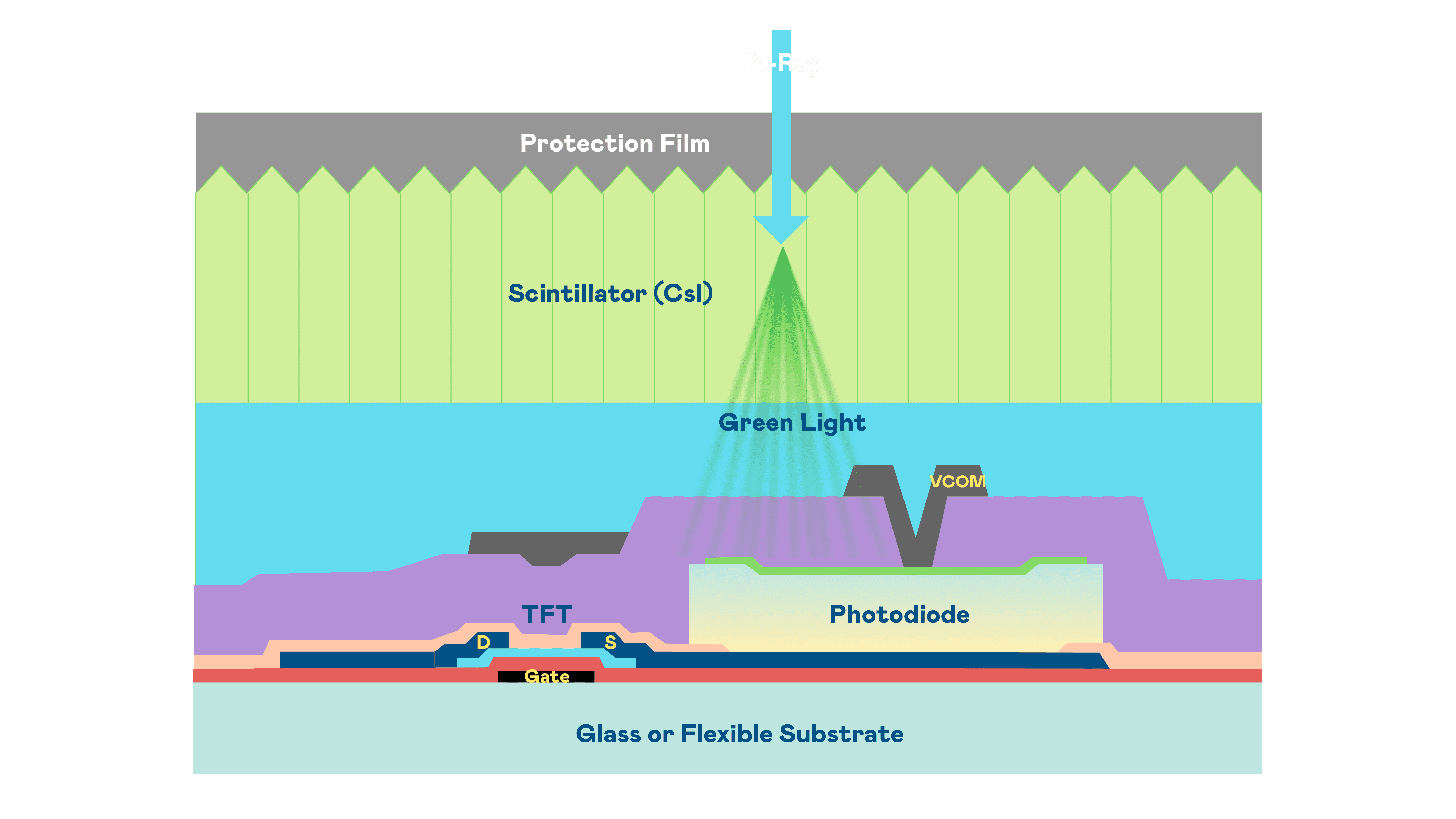 尊时凯龙的X光影像感测阵列使用薄膜电晶体 (TFT) 作为每个像素的读取开关,,搭配光电二极体(Photodiode)的光电转换元件,,,用以感测X光影像讯号。。